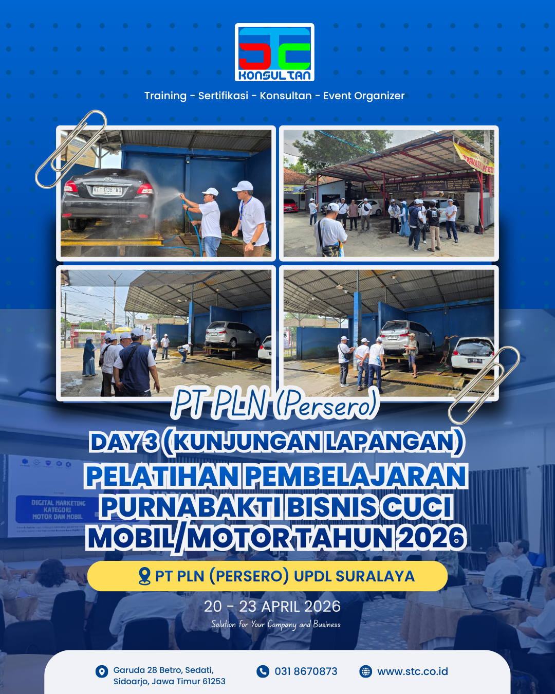Karyawan memerlukan gambaran rill mengenai dunia usaha saat memasuki masa persiapan pensiun. PT PLN (Persero) UPDL Suralaya memfasilitasi hal tersebut melalui Pelatihan Pembelajaran Purnabakti Bisnis Cuci Mobil/Motor Tahun 2026 yang berlangsung pada 20 – 23 April 2026.