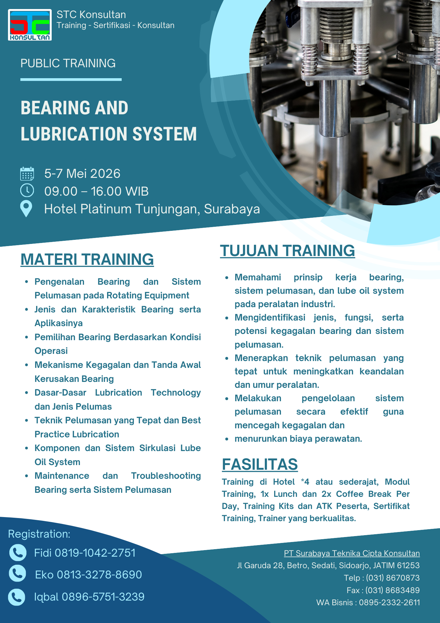 Selanjutnya, PT Surabaya Teknika Cipta Konsultan (STC Konsultan) menjawab tantangan tersebut dengan menghadirkan Pelatihan Bearing and Lubrication System. Kami merancang program ini khusus untuk membekali para teknisi dan praktisi industri dengan pemahaman mendalam. Dengan demikian, Anda dapat memperpanjang umur pakai peralatan sekaligus menekan biaya perawatan secara signifikan melalui manajemen komponen yang tepat.