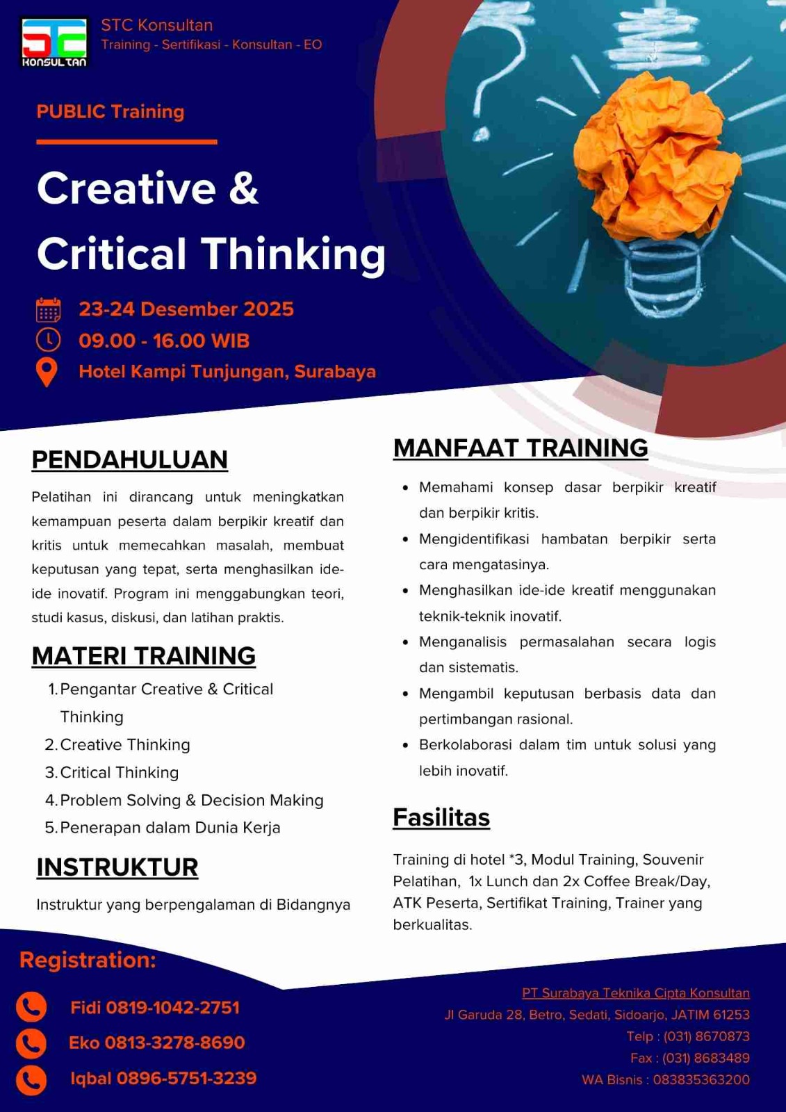 Selain itu, tanpa kemampuan critical thinking yang kuat, proses kerja sering terhambat oleh asumsi, bias, serta pengambilan keputusan yang kurang tepat. Oleh karena itu, STC Konsultan menyelenggarakan training creative & critical thinking di Surabaya sebagai program pengembangan kompetensi yang dirancang aplikatif dan relevan dengan kebutuhan dunia kerja modern.
