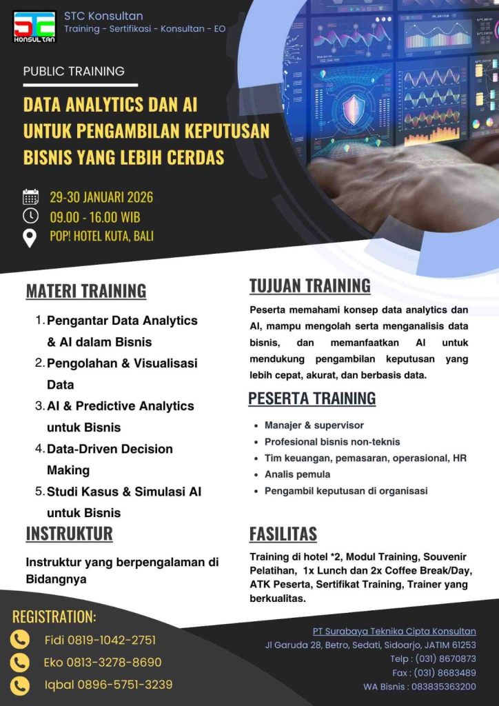 STC Konsultan menghadirkan Public Training Data Analytics dan AI untuk Pengambilan Keputusan Bisnis yang Lebih Cerdas, sebuah pelatihan praktis yang dirancang khusus untuk profesional dan perusahaan non-teknis.