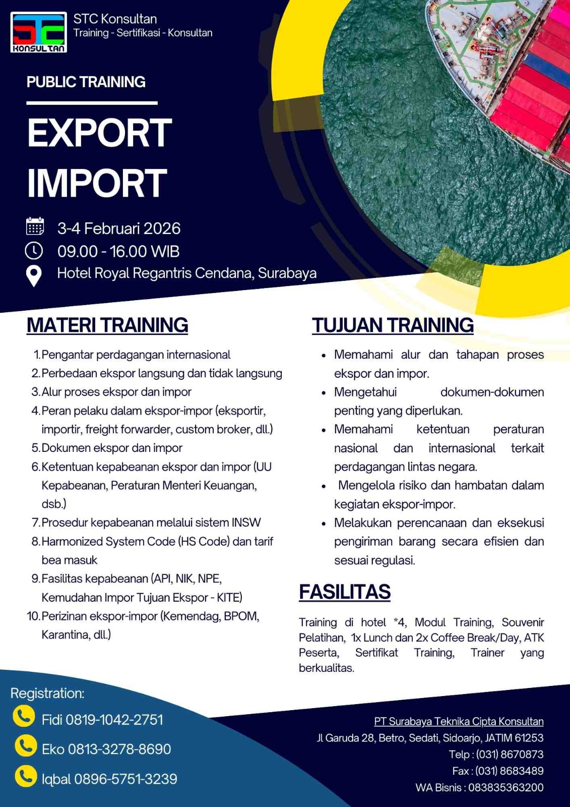 Jangan biarkan kurangnya pemahaman regulasi menjadi penghalang pertumbuhan bisnis Anda di kancah internasional. Bergabunglah dalam Public Training Export Import di Surabaya dan transformasi strategi perdagangan Anda menjadi lebih profesional dan menguntungkan.