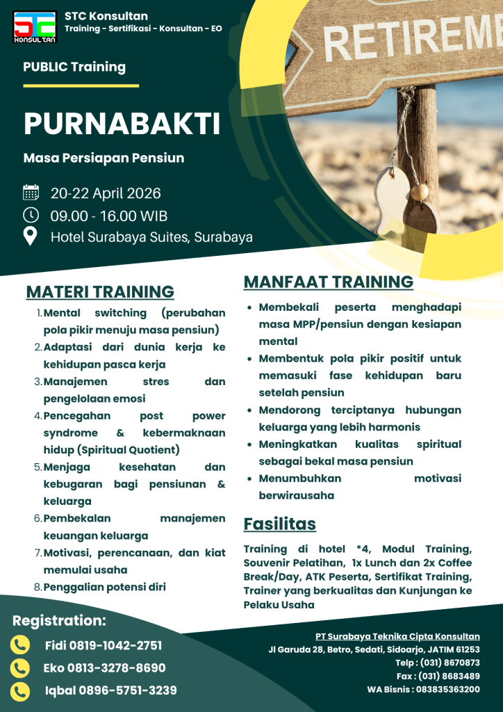 Ingin masa tua yang tenang dan tetap berdaya? Bergabunglah di Pelatihan Purnabakti 20-22 April 2026 Bersama STC Konsultan