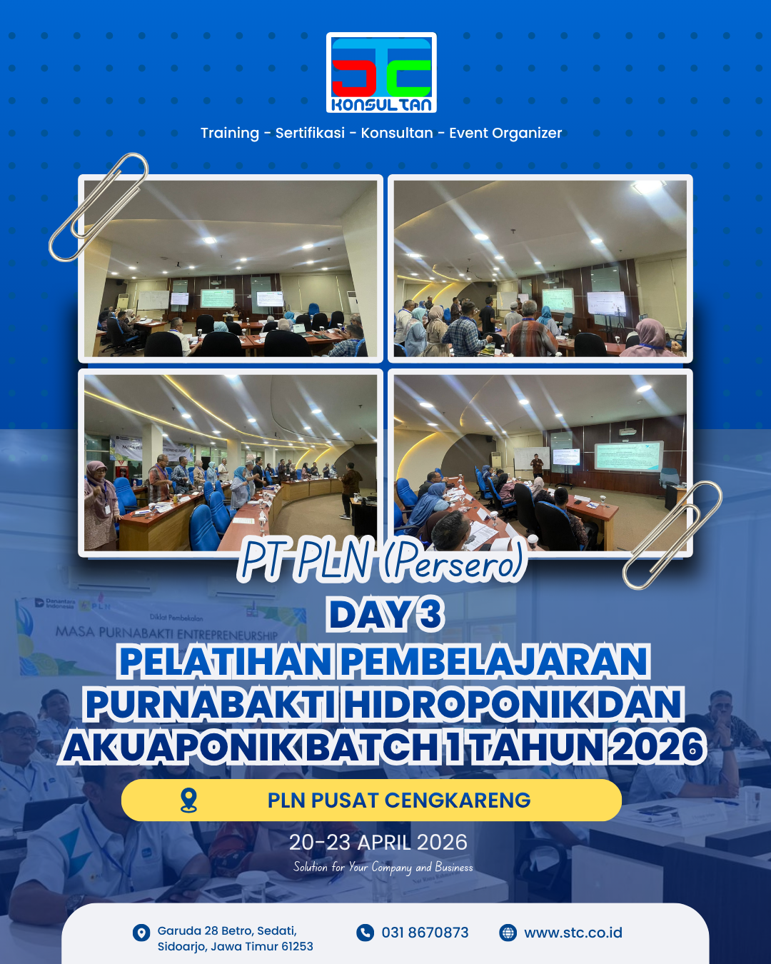 Pengalaman pelatihan Day 3 tim PT PLN (Persero) menunjukkan pentingnya pemahaman bisnis yang komprehensif. STC Konsultan hadir sebagai mitra terpercaya dalam merancang program persiapan hari tua yang aplikatif. Kami berkomitmen menyediakan kurikulum yang selalu mengikuti perkembangan zaman dan kebutuhan pasar. Langkah ini membantu perusahaan menyiapkan transisi terbaik bagi setiap karyawannya.