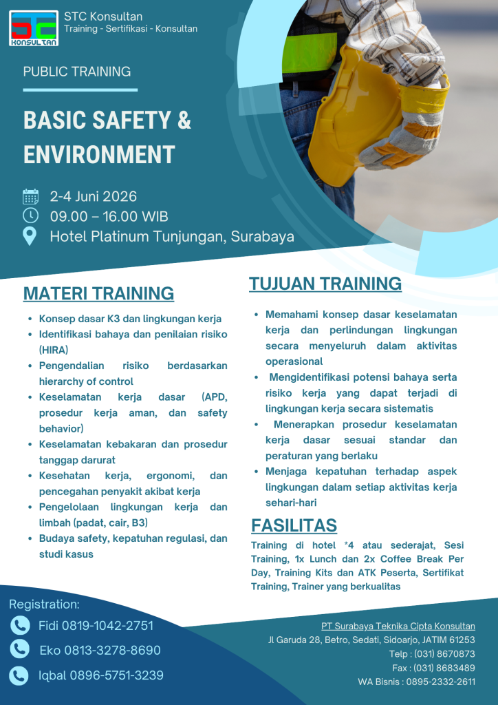 Dalam dunia industri yang kompetitif, setiap perusahaan wajib memprioritaskan aspek Health, Safety, and Environment (HSE). Hal ini karena standar keselamatan yang tinggi merupakan pondasi utama bagi keberlangsungan bisnis jangka panjang. Oleh karena itu, PT Surabaya Teknika Cipta Konsultan menghadirkan program Training HSE melalui tajuk Basic Safety & Environment. Kami merancang pelatihan ini khusus untuk mencetak tenaga profesional yang mampu mengelola risiko serta menjaga kelestarian lingkungan secara mandiri dan efektif.