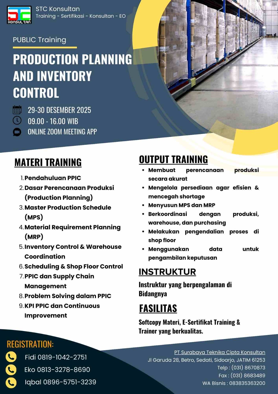 STC Konsultan menghadirkan pelatihan khusus untuk menjawab tantangan tersebut. Program ini dirancang untuk membekali peserta dengan keterampilan praktis dalam merencanakan produksi dan mengendalikan inventaris secara efektif.